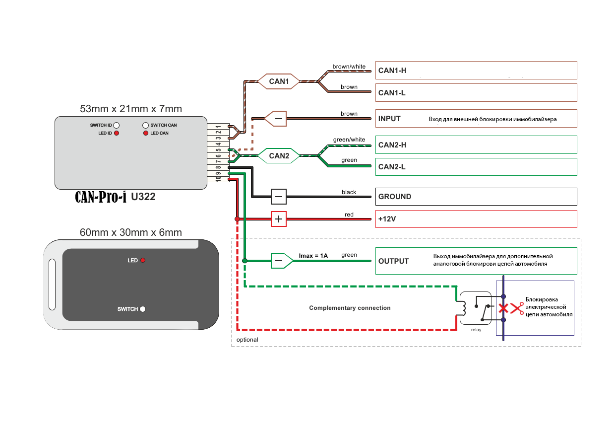 Модуль подключается по 2 проводам, помимо питания, и при отсутствии идентификации водителя шлет в цифровую шину команду на блокировку. Размеры ШхДхВ: 21х26х7 мм Вес: 50 г.